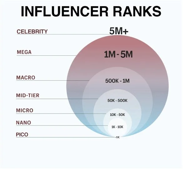 There are various interpretations of influencer classification, but for the sake of this discussion we will settle on six general categories: celebrity influencers, mega influencers, macro influencers, mid-tier influencers, micro influencers, and nano influencers. Think of celebrity influencers as people famous through traditional means of popularity and individuals with social media accounts in excess of 5 million followers. With that in mind we can consider mega influencers as people who are internet famous with over a million followers but fewer than 5 million. Likewise, macro-influencers usually gained fame through the internet itself, whether that was through vlogging, or by producing funny or inspiring content, with followings between 500,000 and 1 million people. Mid-tier influencers occupy the purgatory between the major players and humble startups with 50,000 to 500,000 followers. A micro-influencer is someone who has between 10,000 to 50,000 followers, usually with a highly specific subject interest. Nano-influencers are the most recent form of influencer to gain recognition from marketers with 1,000 to 10,000 followers. They have a smaller audience size, but like other small-scale influencers, are likely to have high levels of loyalty, engagement, and mimicry among their followers.